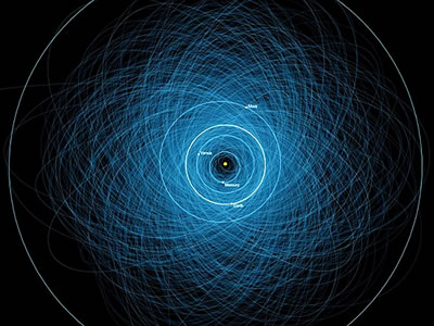 A Nasa (Agência Espacial dos Estados Unidos) divulgou nesta semana um mapa retratando órbitas de 1.400 asteroides classificados como ´potencialmente perigosos´. As rochas gravitam próximas à órbita da Terra e também às de Vênus, Mercúrio, Marte e Júpiter.