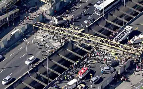 Informações iniciais apontam que haveria pelo menos quatro vítimas feridas no acidente. Um táxi foi completamente esmagado pela passarela. Um carro de passeio também foi atingido pela queda da estrutura.